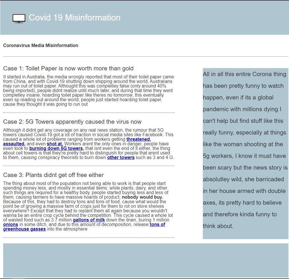 Page about different examples of online misinformation during the initial stage of the pandemic.