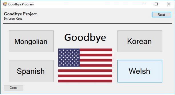 My very first C# program where you can click 4 buttons for 4 different languages that say goodbye, along with showing the languages flag.